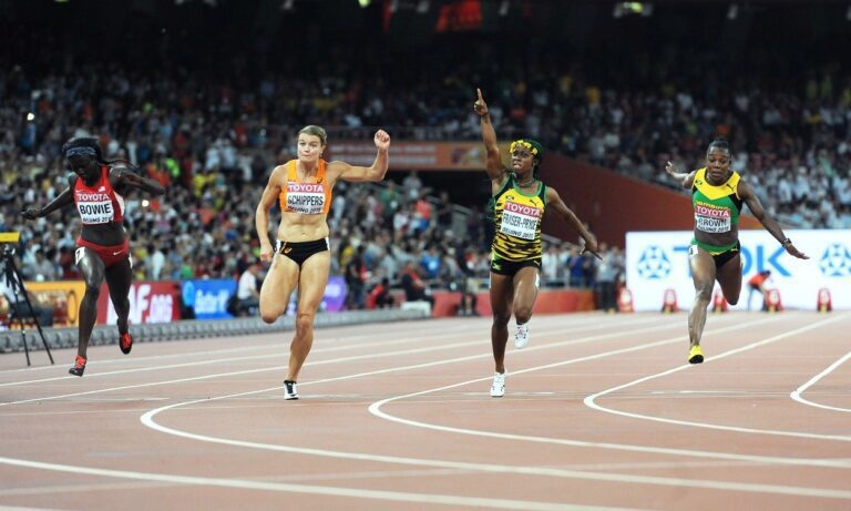 http://www.athleticsweekly.com/wp-content/uploads/2016/01/shelly-ann-fraser-pryce-100m-768x461.jpg 768w, http://www.athleticsweekly.com/wp-content/uploads/2016/01/shelly-ann-fraser-pryce-100m.jpg 1250w" sizes="(max-width: 750px) 100vw, 750px" />Athletes sometimes talk about getting their “championship face” on. In Fraser-Pryce’s case it is her championship hair. In Moscow 2013 she had pink hair extensions and that year opened her own hair salon, Chic Hair Ja, which is about “accentuating the natural beauty of women – targeting all women who aspire to have that chic look at an affordable price